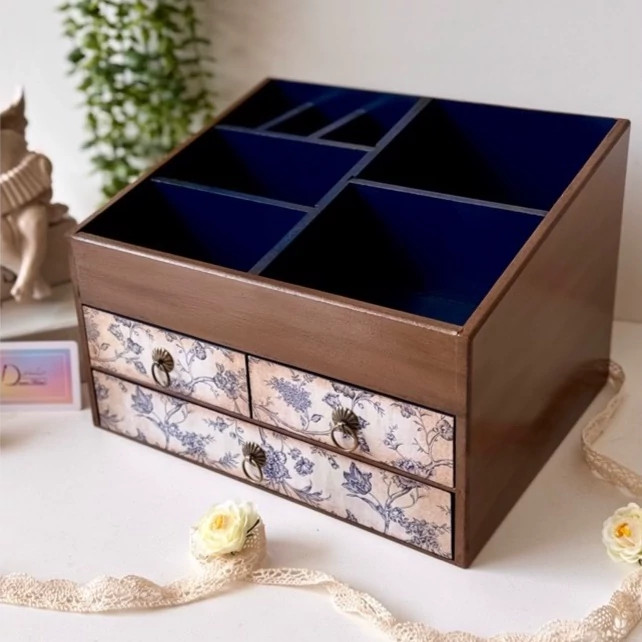 این استند زیبا که با ترکیب رنگ چوب وسورمه ای ساخته شده از نظر طراحی به گونه ای هست که همه لوازم آرایش تون در هر سایزی را داخل خودش به راحتی جا میده