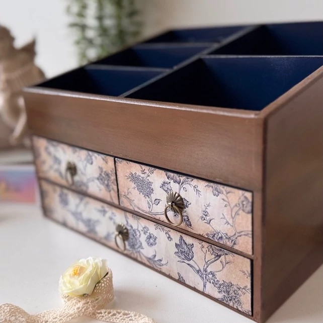 این استند زیبا که با ترکیب رنگ چوب وسورمه ای ساخته شده از نظر طراحی به گونه ای هست که همه لوازم آرایش تون در هر سایزی را داخل خودش به راحتی جا میده