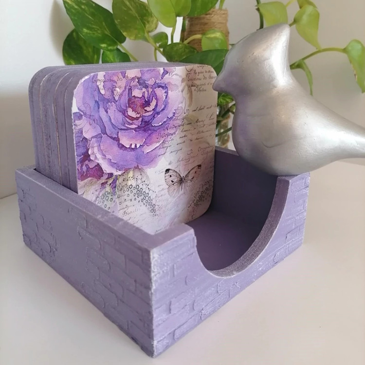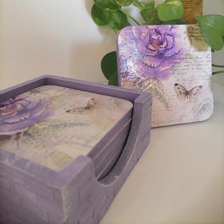 زیرلیوانی چوبی طرح گل بنفش