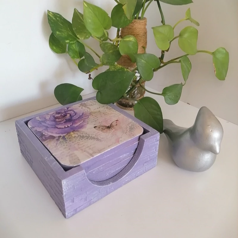 زیرلیوانی چوبی طرح گل بنفش